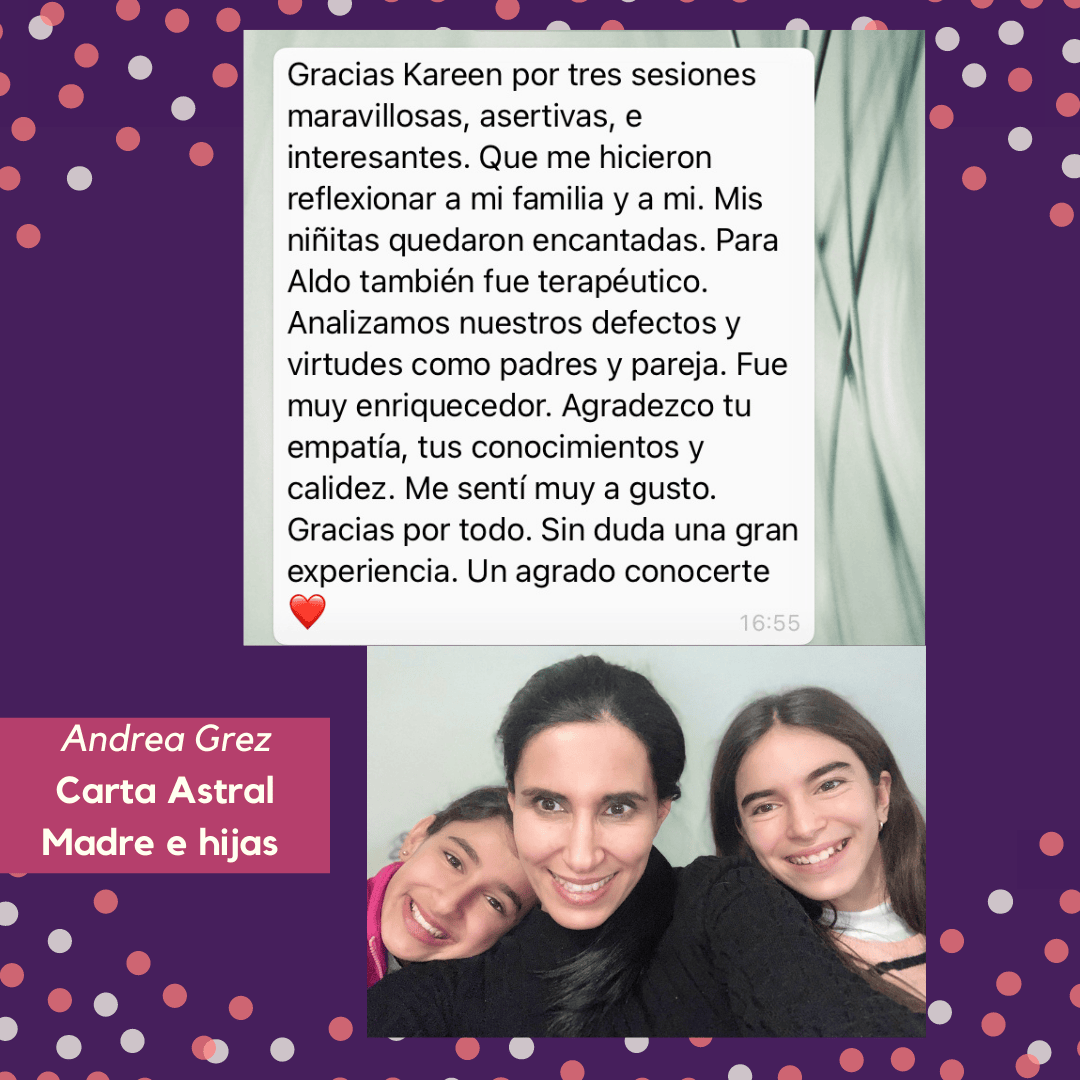 Me especializo en la lectura de Cartas Astrales de Niños, Adultos y Familias, con más de 450 lecturas a la fecha. Además realizo Clases de Astrología y talleres dirigidos a mamás y mujeres que deseen un encuentro consigo mismas y sus hijos.
